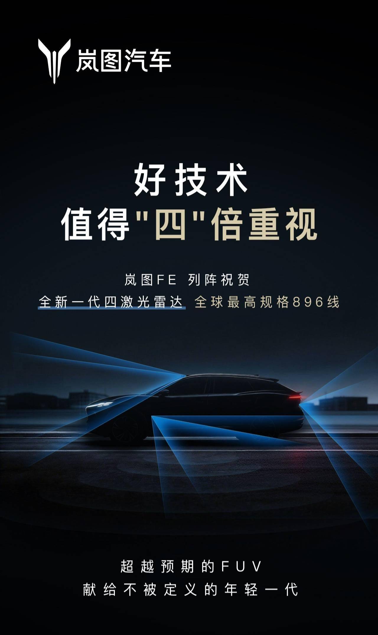 发布会结束后,岚图汽车通过官方社交媒体向华为致贺,并同步预热旗下多款新车。官方文案中特别强调“四”这一关键词,结合预告图中多道光束的剪影设计,暗示其新车将采用与尊界S800、问界M9同款的四激光雷达配置。这一技术布局与岚图此前公布的车型规划形成呼应。