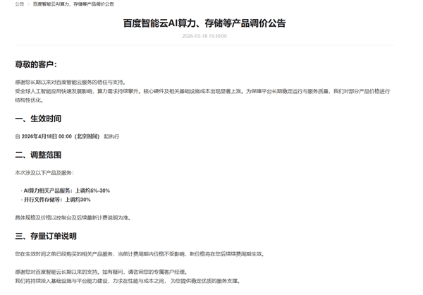 百度智能云在公告中指出,此次价格调整涉及AI算力服务与并行文件存储两大产品线。其中,算力服务价格将上调5%至30%,存储产品价格上调幅度约为30%。公司特别说明,已购买服务的用户在当前计费周期内不受影响,新价格仅适用于后续续费场景。这一调整被视为应对全球AI算力需求激增与硬件成本攀升的双重压力。