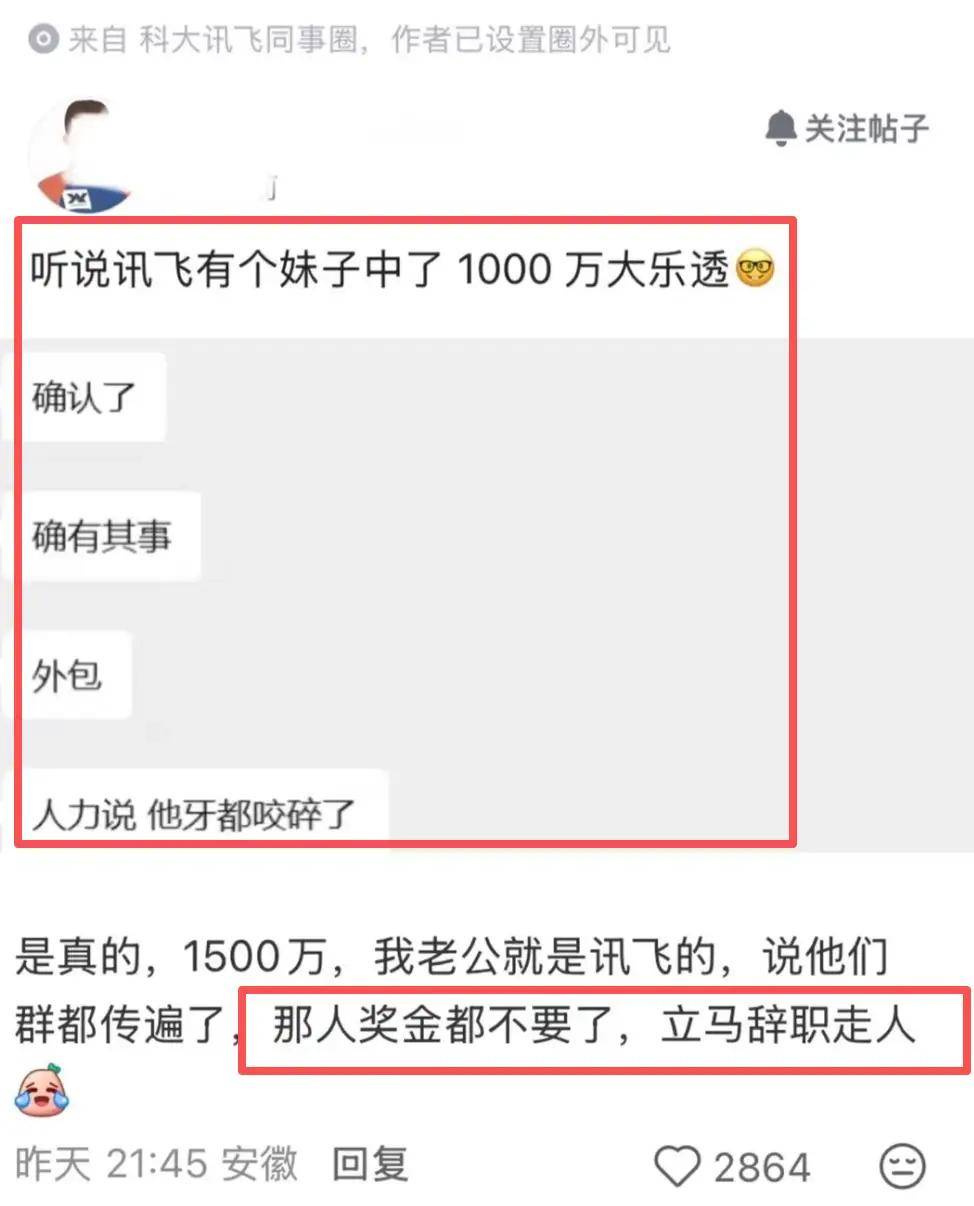 近日,一则关于科大讯飞员工中得巨额彩票大奖后辞职的消息引发社会广泛关注。据多方信息证实,这名来自科大讯飞的女性员工(据传为外包岗位)在购买彩票后意外斩获1500万元大奖,随后迅速办理离职手续,甚至放弃了应得的工作奖金,这一举动在社交平台引发热议。