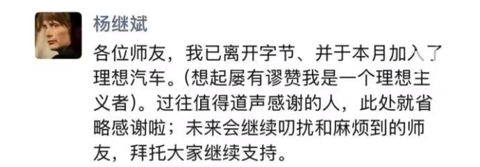前字节跳动公关总监杨继斌近日通过社交平台宣布,已正式加盟理想汽车担任公关相关职务。他在朋友圈发布动态称:"从互联网行业转战新能源汽车领域,既是对个人职业路径的重新规划,也契合我对行业发展的长期观察。感谢过往共事伙伴的支持,期待在新赛道与各位继续交流。"