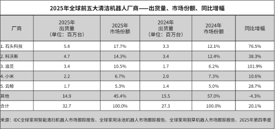 根据国际数据公司(IDC)最新发布的《全球家用智能清扫机器人市场跟踪报告》,2025年全球家用清洁机器人市场延续强劲增长态势,全年出货量突破3272万台,较上一年度提升20.1%。作为该领域的核心品类,扫地机器人以2412.4万台的出货量贡献了主要增量,同比增长17.1%,展现出稳定的市场需求。