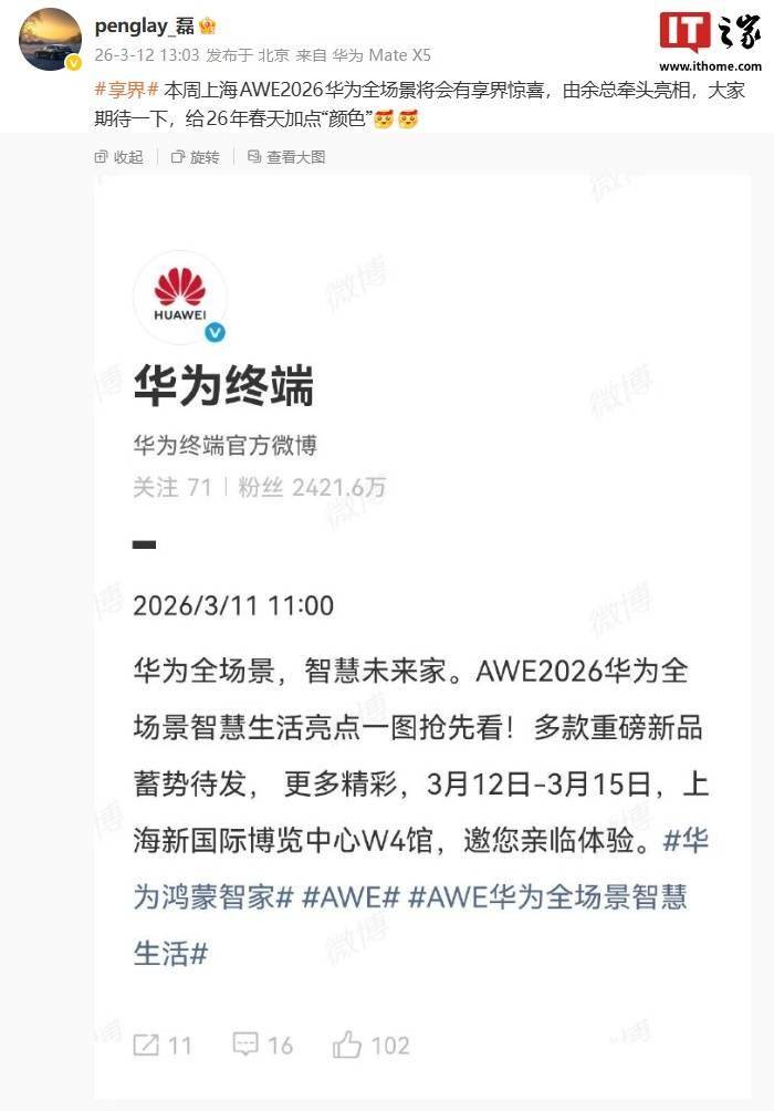 华为终端官方近日对外公布了AWE 2026华为全场景智慧生活的“亮点一图抢先看”,同时宣布将有多款重磅新品在展会上亮相,引发了科技圈和消费者的广泛关注。