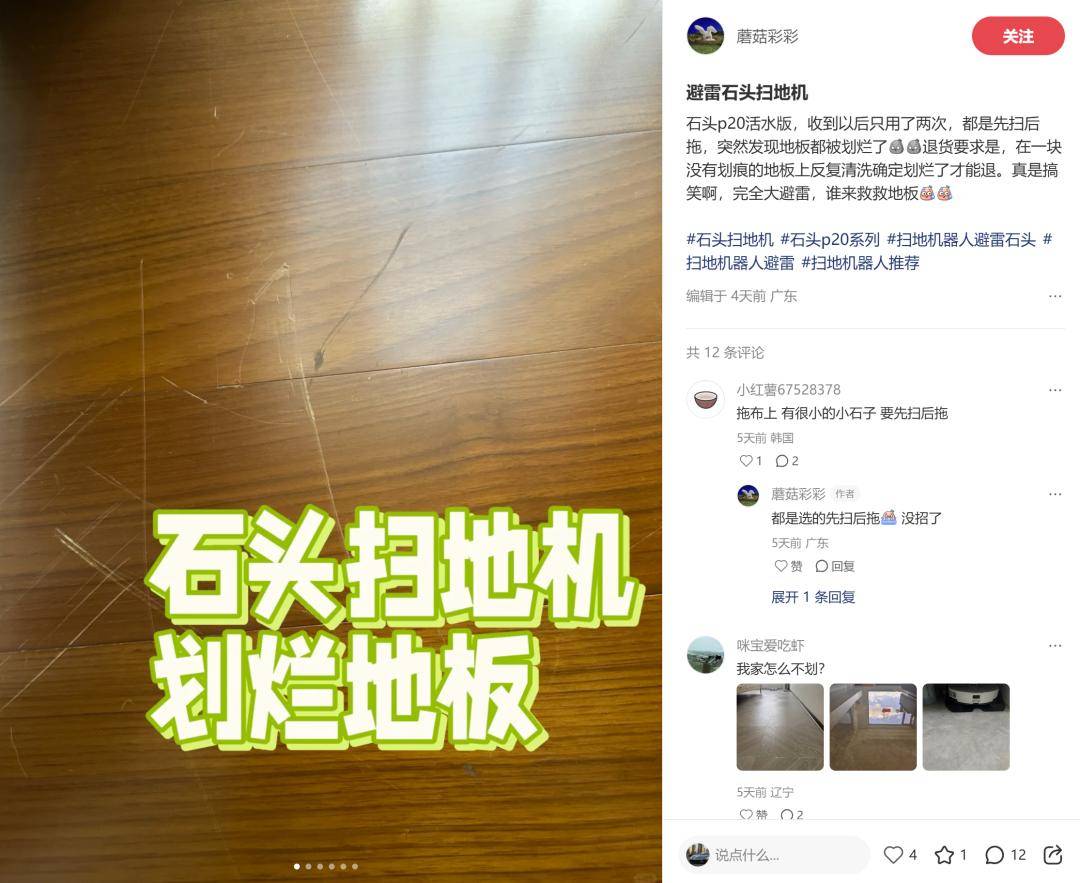 这场个案背后,是社交平台上铺天盖地的同类投诉。在小红书等平台搜索“石头扫地机 划伤”,大量用户晒出瓷砖、木地板被刮出刀割般痕迹的照片。从P10系列到P20系列,多款主力机型均涉及此类问题,用户描述中“避雷”“天塌了”“刮地收割器”等词汇频繁出现。更值得注意的是,这些划痕多发生在机器旋转拖地时,且一旦出现便无法修复,暴露出可能存在的系统性设计缺陷。