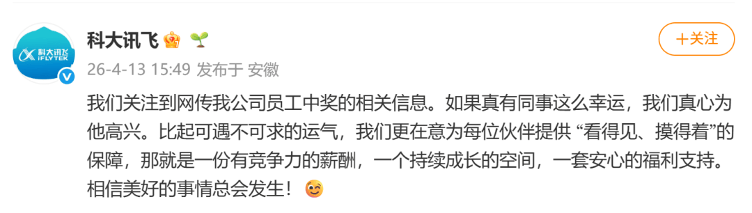 针对这一传闻,科大讯飞官方账号发布回应称,公司已关注到相关网络信息,并表示如果真有同事如此幸运,公司会真心为其感到高兴。同时,科大讯飞强调,比起不可预测的运气,公司更注重为每位员工提供切实的保障,包括有竞争力的薪酬、持续成长的空间以及安心的福利支持。