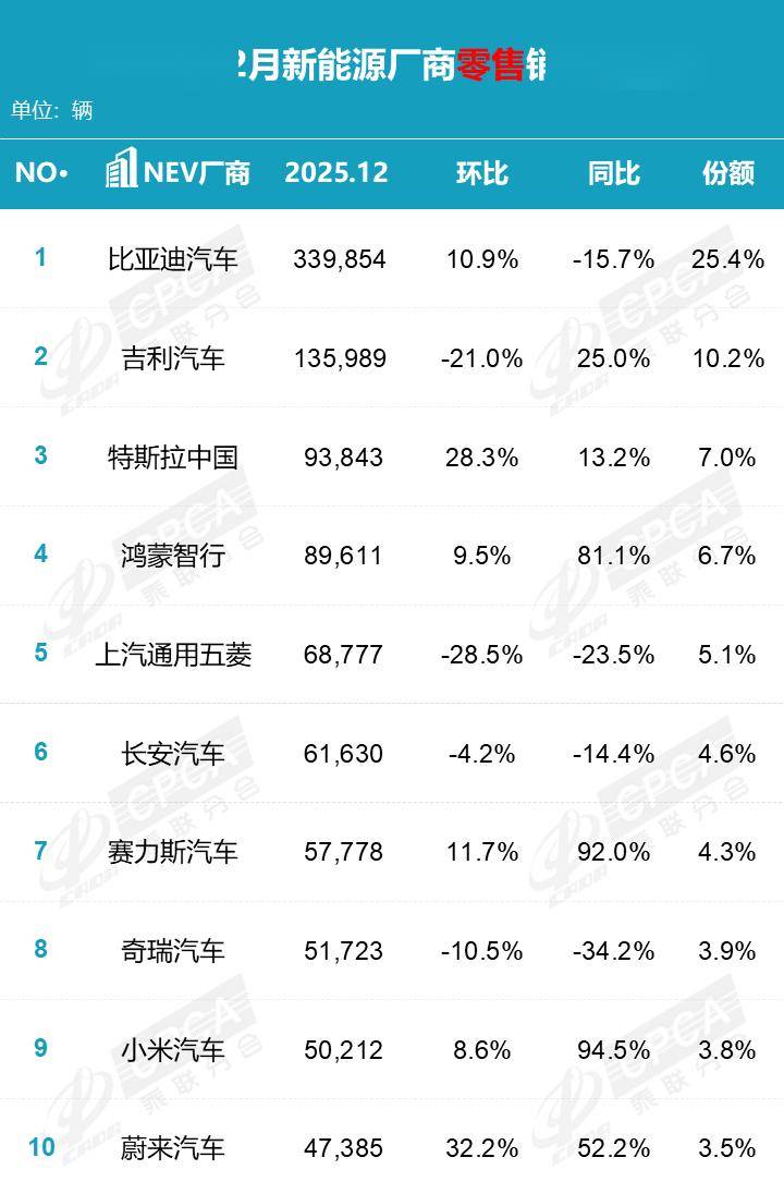 在新能源乘用车市场,各大厂商的竞争异常激烈。从2025年12月的新能源厂商零售销量榜单来看,比亚迪汽车、吉利汽车、特斯拉中国等十家车企脱颖而出,跻身前十。这些车企凭借各自的优势,在市场中占据了一席之地。其中,小米汽车的表现堪称惊艳,以94.5%的同比涨幅领跑榜单,12月销量达50212辆,成为市场中的一匹黑马。