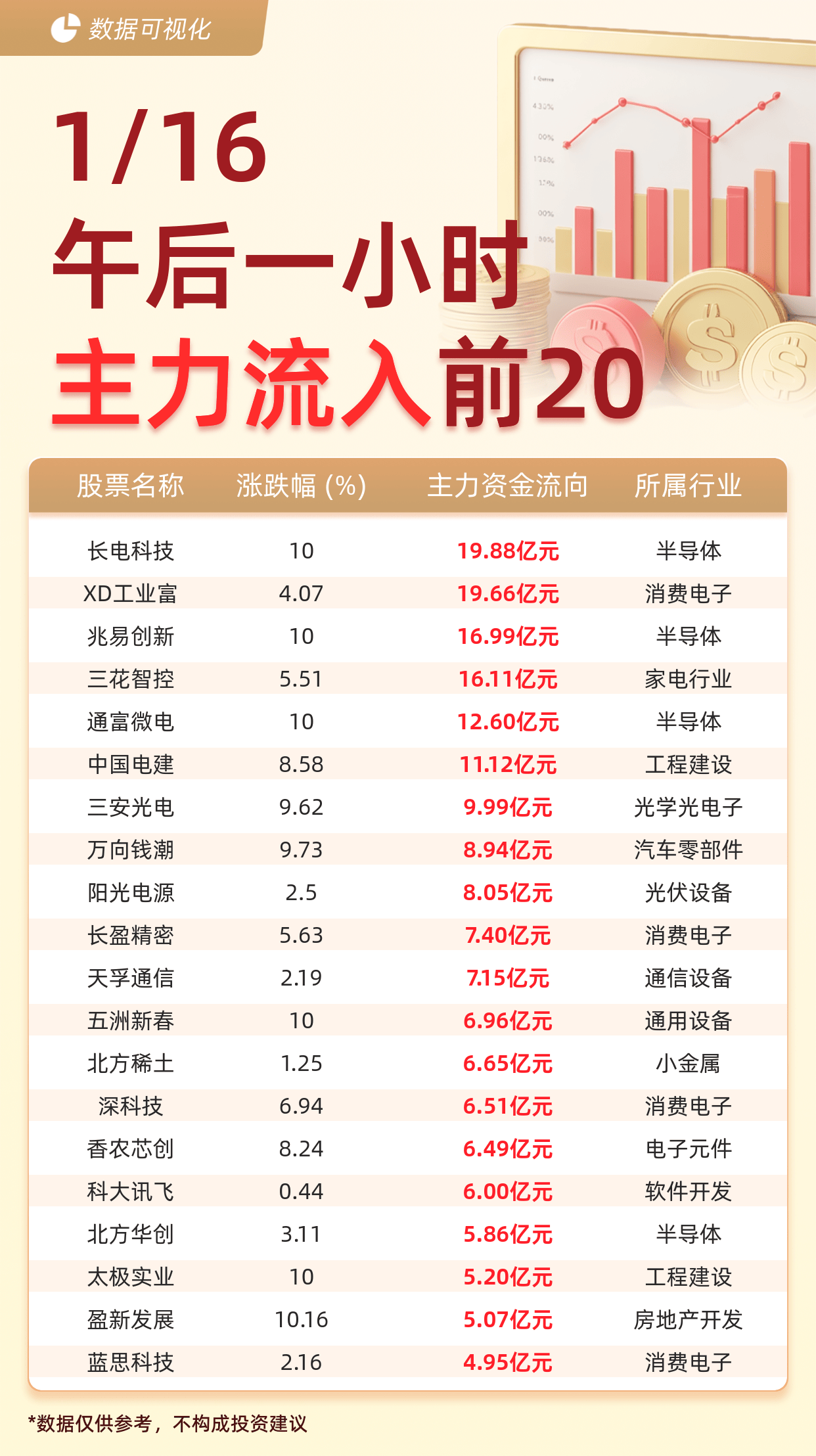 根据交易所最新披露的资金流向数据,1月16日午后交易时段内,A股市场主力资金呈现显著集中态势,20只个股合计获得超160亿元资金净流入。其中半导体板块成为资金追捧焦点,长电科技以19.88亿元净流入额领跑全市场,兆易创新、通富微电等产业链企业同步获得大额资金加持。