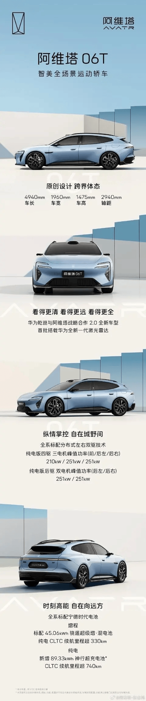 根据工信部最新申报数据及官方预热信息,阿维塔06T在车身设计上展现出越级尺寸优势,长宽高分别达到4940mm、1960mm和1475mm,配合2940mm超长轴距,为车内空间布局提供了充足保障。技术配置方面,该车成为华为新一代激光雷达系统的全球首发车型,同时全系标配分布式左右双驱技术,并搭载宁德时代专为双动力系统研发的定制化电池组。