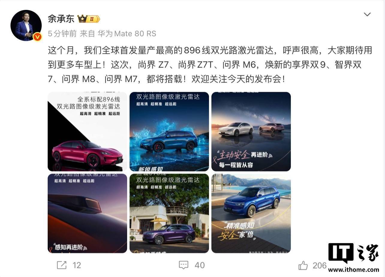 华为常务董事、产品投资委员会主任、终端BG董事长余承东今日通过微博宣布,华为将全球首发量产896线双光路激光雷达,并确认该技术将应用于多款新车型。这一突破性成果凭借其行业领先的性能参数,引发市场广泛关注。